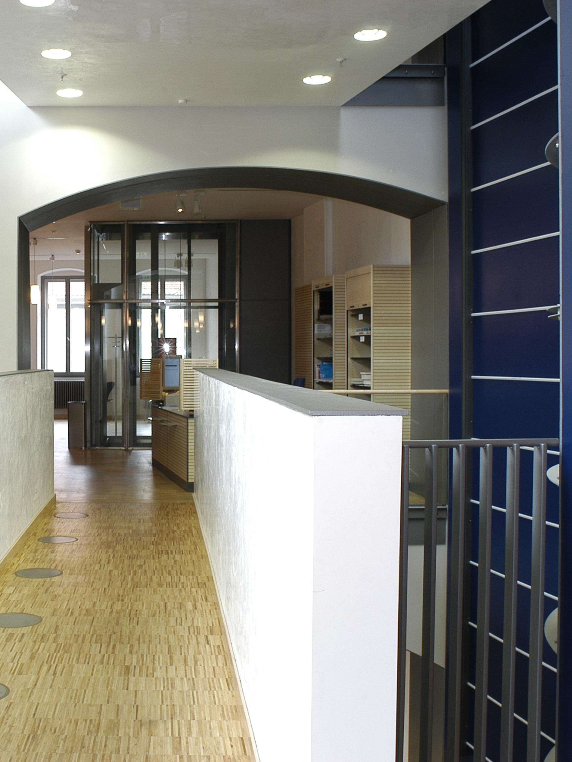 Die Informations- und Anmeldetheke sowie vier Internetarbeitsplätze befinden sich im ersten Obergeschoß. Im Lesecafé im zweiten Obergeschoß liegen Zeitungen und Zeitschriften aus und Besucher können sich am Kaffeeautomaten bedienen. Im gesamten Haus befinden sich für die Nutzer zugängliche Computer, an denen sowohl im Medienbestand der Bücherei recherchiert, als auch das eigene Leserkonto eingesehen werden kann.